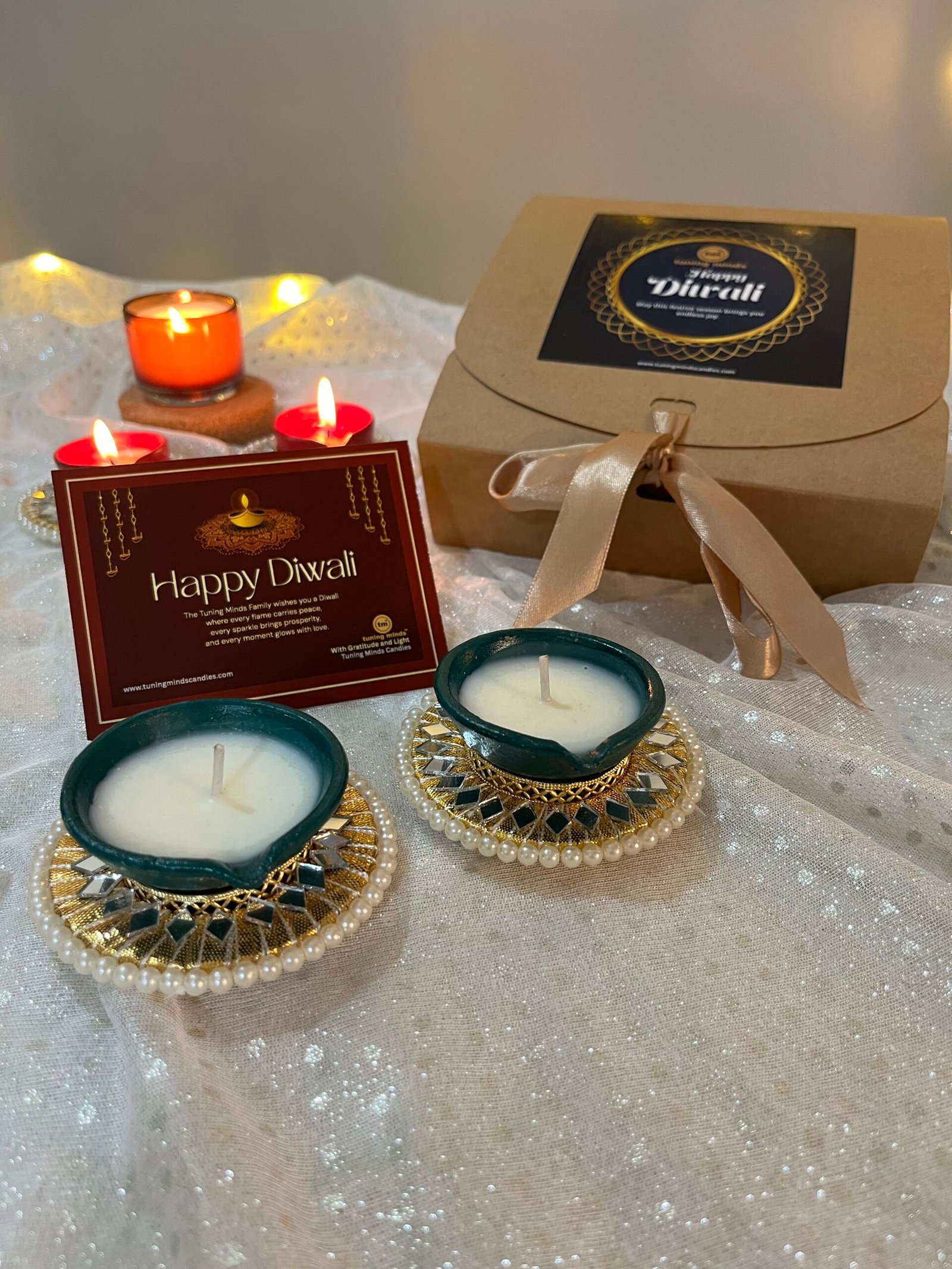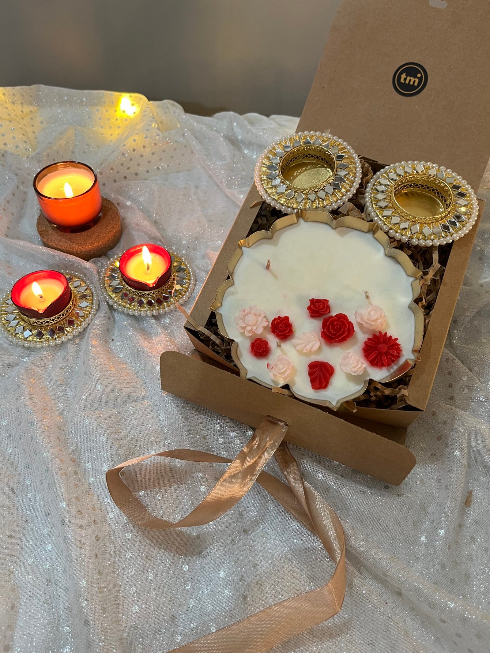 This classic hamper includes- scented lotus urli candle, pair of tealight holders & 2 handmade diyas.