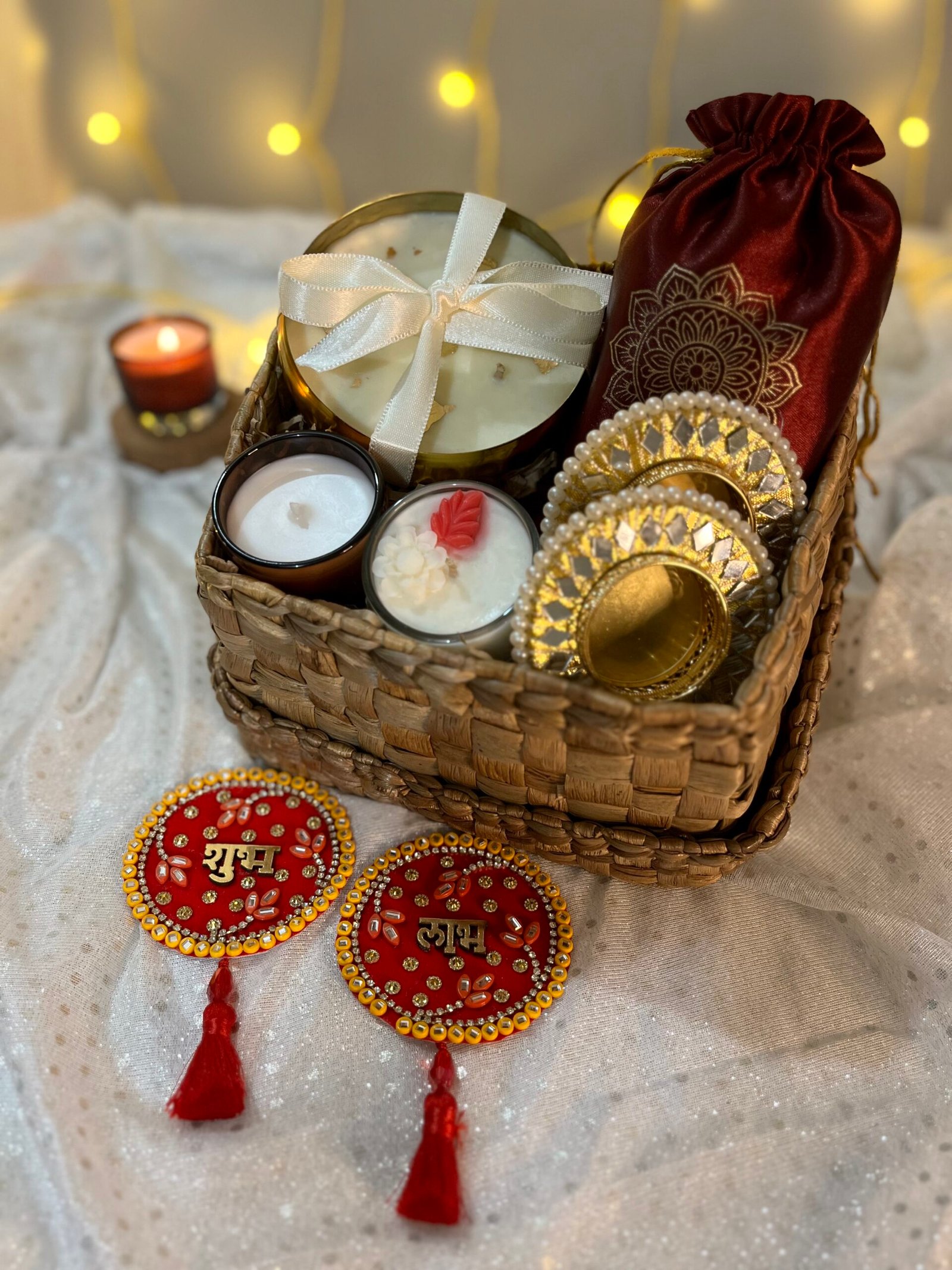 This luxury hamper includes- Shubh-Labh decorative hanging, scented hamer urli candle, 2 small scented candles, pair of tealight holders, 2 handmade diyas & nuts.