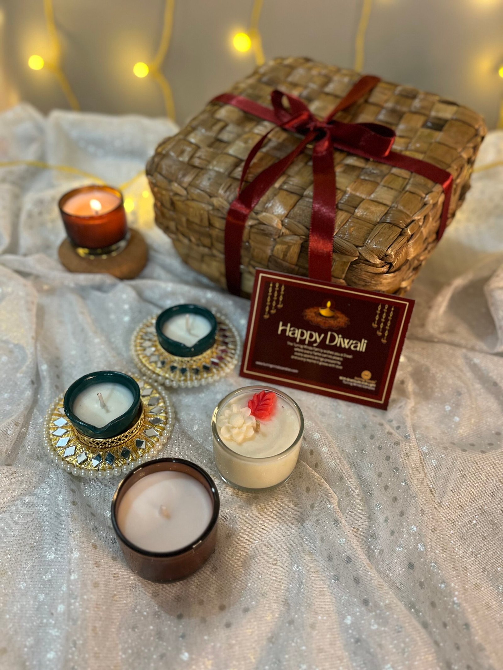 When lights glow brighter and fragrances whisper of festivity, joy finds its way home. Our Luxury Diwali Hamper is a symphony of hand-poured candles, rich aromas, and elegant accents — each piece crafted to honor the timeless beauty of Diwali.